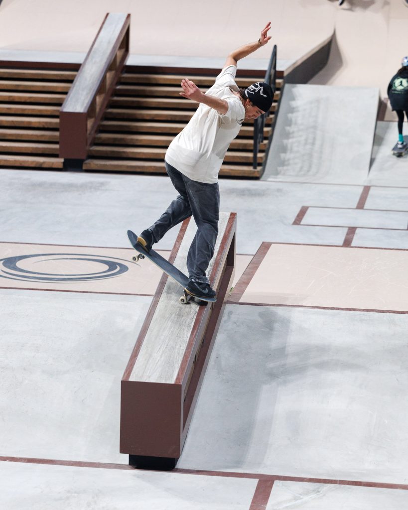 まず順調にランをアップデートして2本目で得点を伸ばしたのは、「SLS TOKYO」や 「X GAMES CALIFORNIA 2023」で優勝を果たしたものの、まだパリオリンピック予選大会では白星を上げられていない堀米雄斗。2本目では「ノーリー270スイッチバックサイドリップスライド」や「ノーリーヒールフリップバックサイドボードスライド」、「ノーリー270フロントサイドボードスライド」など、得意のノーリーと270をベースとしたトリックでランをフルメイクで終えるとベストスコアを84.62ptへ引き上げた。過去のワールドスケートボーディングツアー(WST)でまだ表彰台に上がれていない彼はまた特別な思いでこの決勝に挑んでいるのがランから垣間見れた。