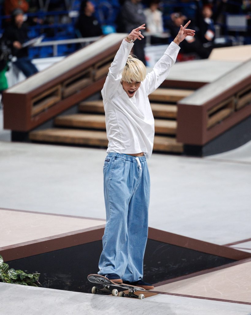 また1本目のミスを大きく改善してベストトリックに良い流れで繋いだのは、今年の2月開催された2022年度の世界選手権では3位入賞し、先日の全日本選手権で優勝して弱冠13際でありながらも世界トップスケーターとして評価されている小野寺吟雲。他の選手より対空時間が長いのではないかと錯覚させるほど様々なトリックを1本にまとめてくるのが特徴の彼は、ラン1本目ではトリックのランディングにミスし転倒。得点を伸ばせないでいたが2本目では「フロントサイドブラントスライド to ショービットアウト」や「トレフリップフロントサイドボードスライドフェイキー」などを取り入れたランをフルメイクでまとめて83.25ptとして、決めた瞬間は天に両腕の突き上げて喜ぶ様子も見られた。