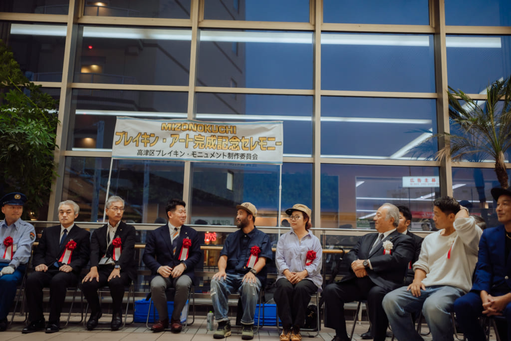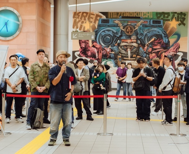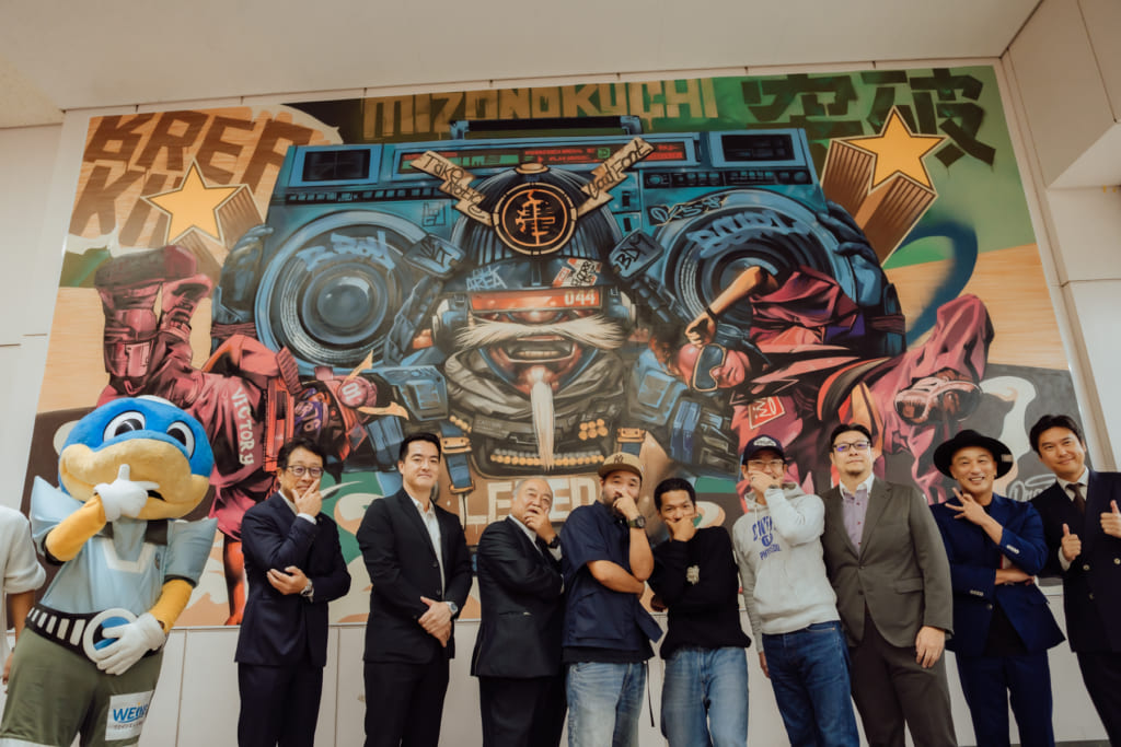12日間の制作期間を経て完成した今回の壁画の一般公開を祝して「MIZONOKUCHI ブレイキン・アート完成記念セレモニー」が先月10月11日(土)に執り行われ、今回の制作に携わった「高津区ブレイキン・モニュメント制作委員会」のメンバーはもちろんのこと、JR武蔵溝ノ口駅駅長や川崎市長をはじめ官公庁の来賓の方が招かれ、JRや駅ビルを利用される一般のお客様にもオープンな形でお披露目された。