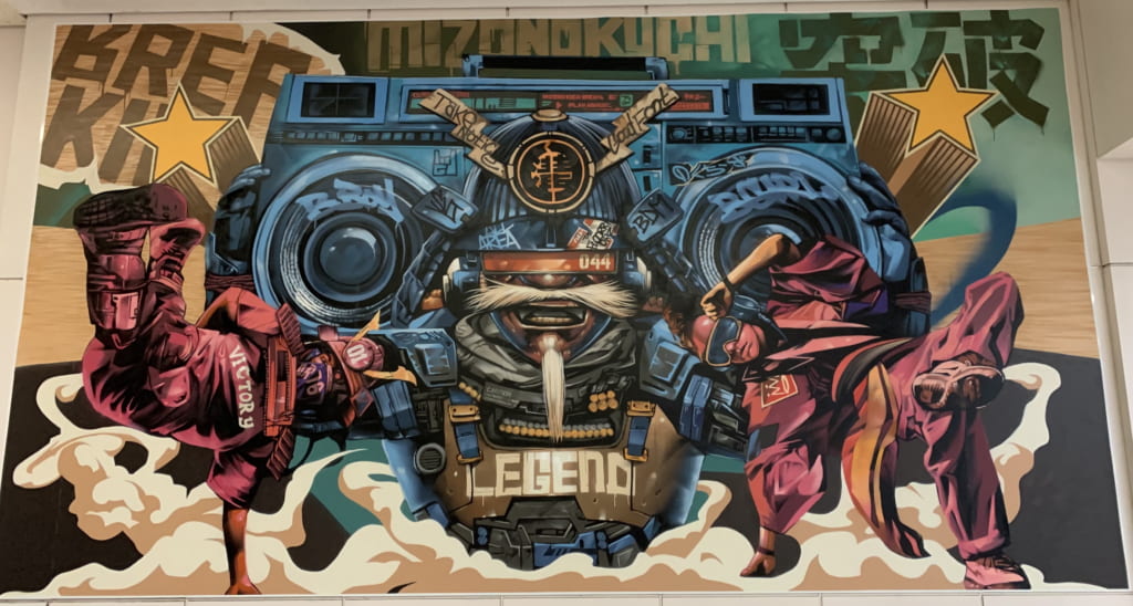 この度、日本のストリートカルチャー発信の中心地であり、世界で大活躍するB-Boy/B–Girlたちが生まれた「ブレイキンの聖地」として知られている「MIZONOKUCHI(溝の口)」を象徴する壁画がJR南武線武蔵溝ノ口駅の南北自由通路に展示されている。今回の作品はストリートカルチャーの世界で活躍する日本人ミューラルアーティストDRAGON76氏が制作を手がけ、まさにブレイキンの聖地「MIZONOKUCHI」の歴史を伝え、日本のストリートカルチャーの今を表現する地域から愛される作品となった。
