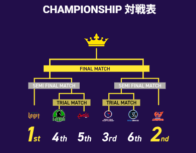 CHAMPIONSHIPはトーナメント方式で開催され、 見事勝ち抜いたチームがSEASON CHAMPIONに輝く。トーナメントはTRIAL MATCH(準々決勝)・SEMI FINAL MATCH(準決勝)・FINAL MATCH(決勝)の3つで構成され、REGULAR SEASON1位or2位で通過したチームは、シードによりSEMI FINAL MATCHからの対戦となる。