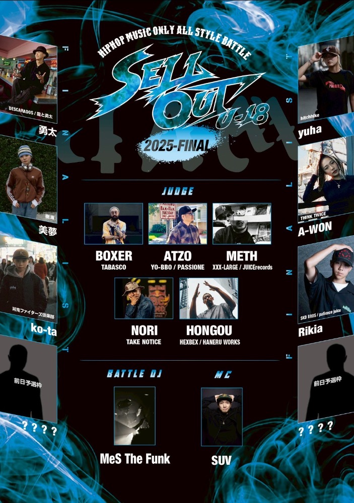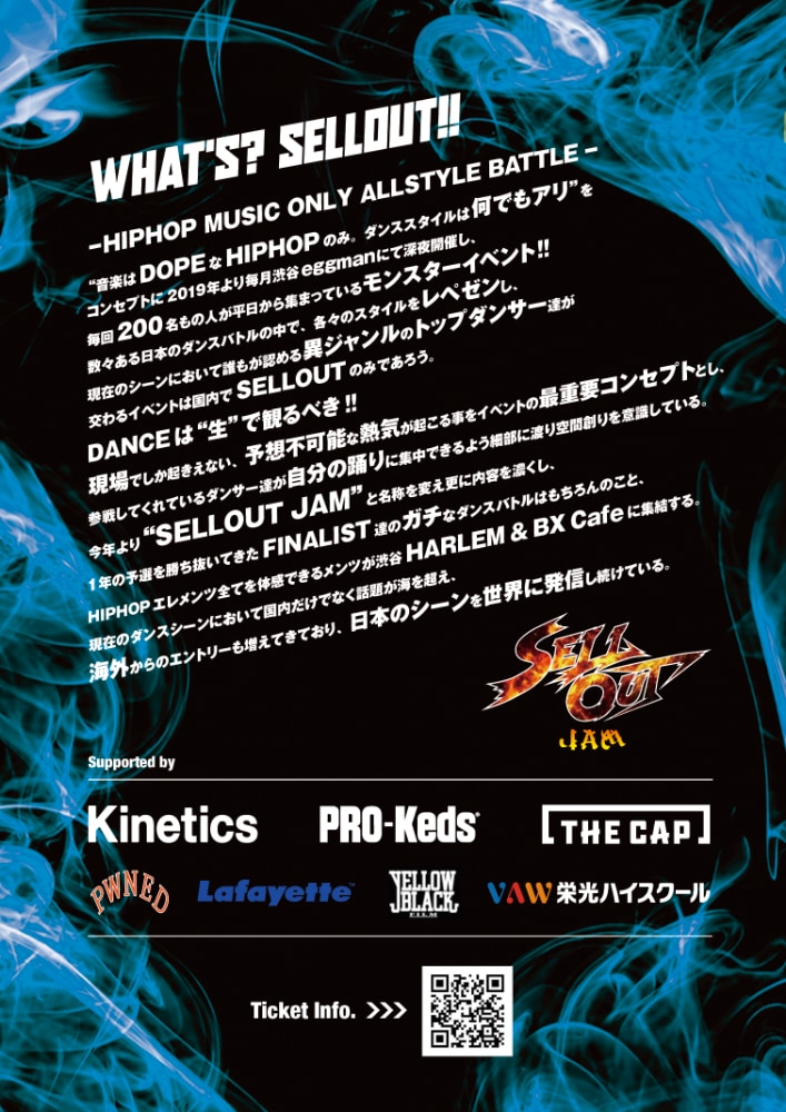 今年より”SELLOUT JAM”と名称を変え更に内容を濃くし、1年の予選を勝ち抜いてきたFINALIST達のガチなダンスバトルはもちろんのこと、HIPHOPエレメンツ全てを体感できるメンツが渋谷HARLEM & BX Cafeに集結。現在のダンスシーンにおいて国内だけでなく話題が海を超え、海外からのエントリーも増えてきており、日本のシーンを世界に発信し続けている。