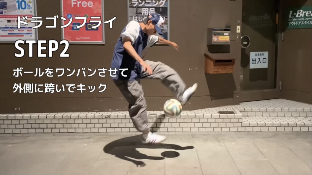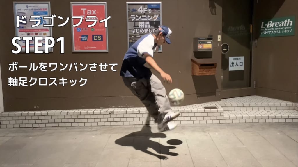 STEP1ではボールをワンバンさせて軸足立ちの状態で足を交差させてキックしてみよう。ドラゴンフライはクロスオーバー同様に、軸足に重心を乗せてジャンプしながらボールを蹴ると同時に跨ぐトリック。ドラゴンフライもボールを蹴る足が軸足になるのがポイント。