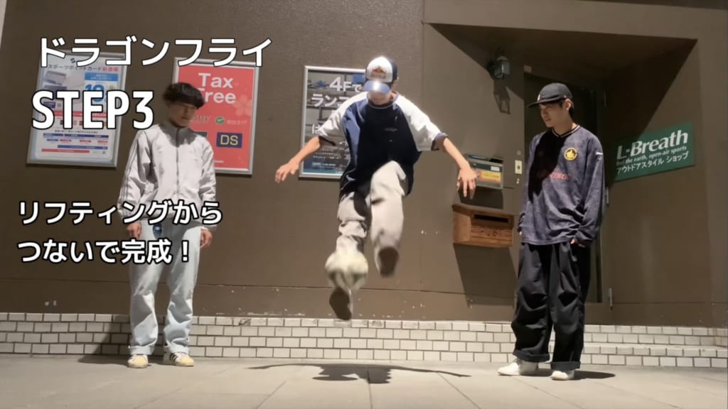 STEP2の動きに慣れてきたら最後はリフティングからつないで完成!リフティングからドラゴンフライを行う場合は、早めに軸足に重心を移しておいてトリックに入る準備をしておくとやりやすい。軸足と跨ぎ足を準備したら焦らずにボールが落ちてくるのを待ってみよう。