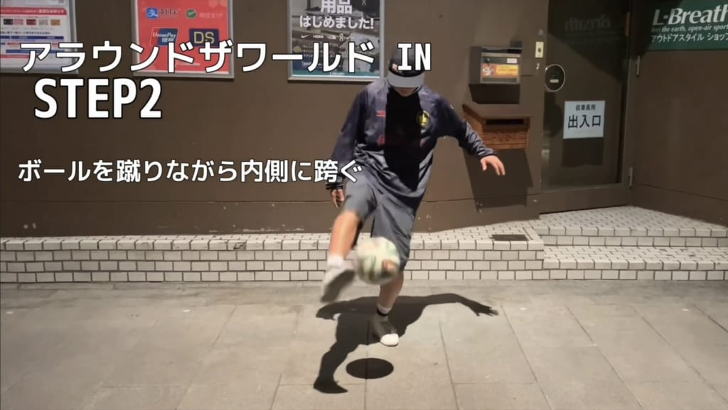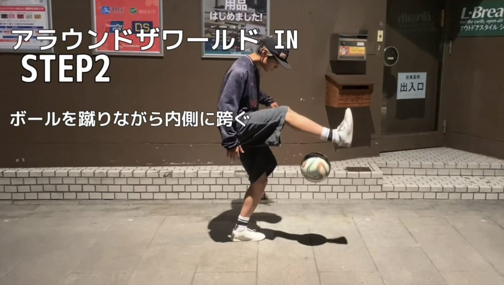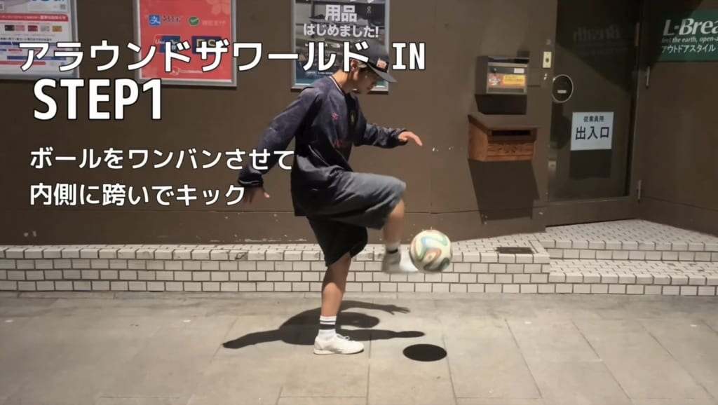 アラウンドザワールドを分解し、STEPごとに練習するのがポイント。STEP1は、ボールをワンバンさせてから跨いでキック。ここでボールを跨ぐ動きと跨いでから拾う動きに慣れておこう。