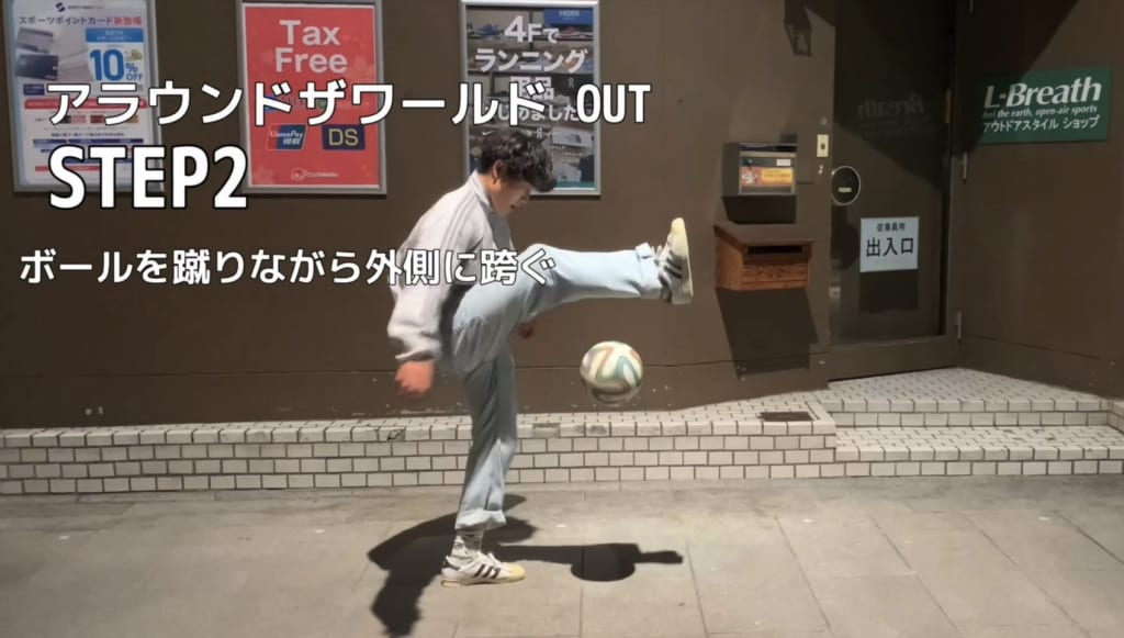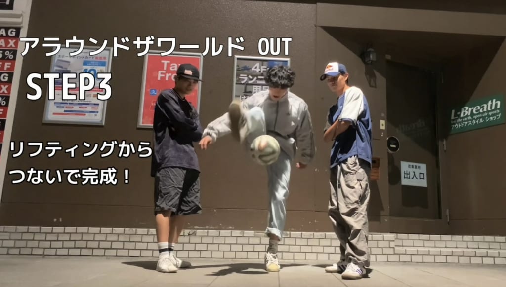 つま先の向きを工夫することで、蹴り上げたボールが膝裏のスペースに入って跨ぎやすくなる。この仕組みを理解できればアラウンドザワールドのメイクは目前!