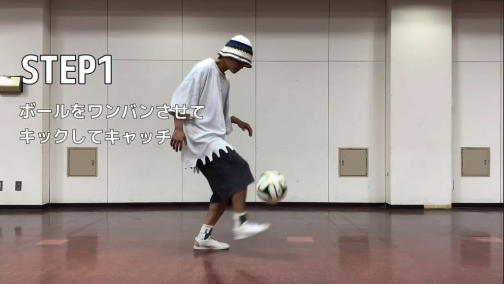 まずはボールをワンバウンドさせてからキック。ここでボールを真上に上げる感覚を掴んでおこう。毎回同じ位置、同じ高さでできるように何度もトライしよう。