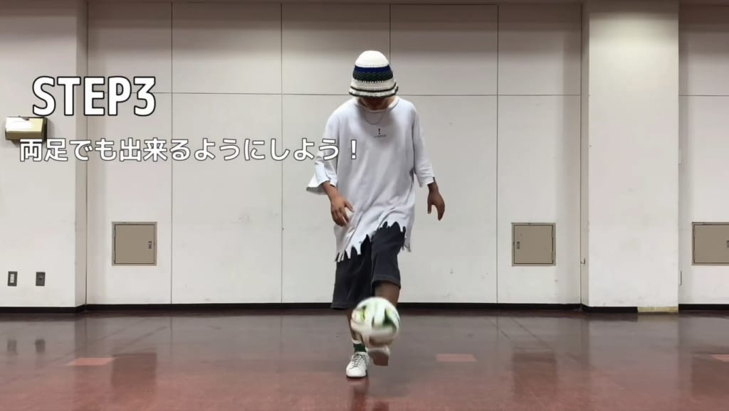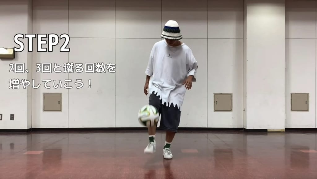 1回ずつ完璧に蹴り上げられるようになったら、回数を増やしてみよう。動画では落とさずにリフティングしているが、最初はワンバウンドさせながら回数を増やしていくのも効果的だ。