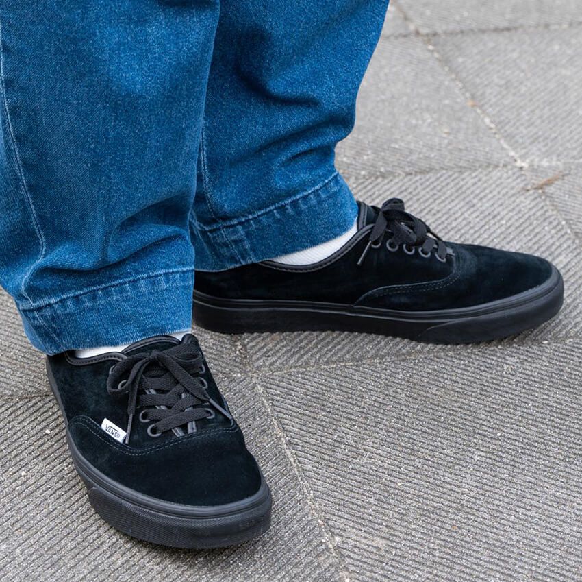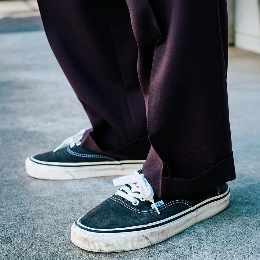 選んだのは、スエードのオーセンティック。シューレースやソールまでオールブラックの一足が、コーディネイトのまとめ役として存在感を発揮している。