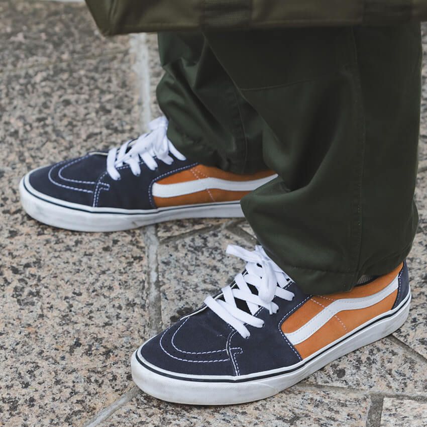 足元のヴァンズは、ご存じの名作“スケートハイ”をローカットにアレンジした“スケートロー”。