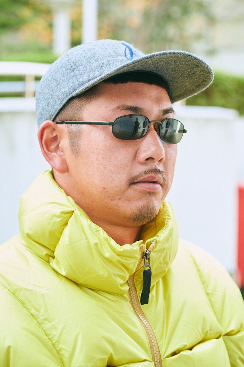 ダウンジャケット=ゴールドウインゼロ パンツ=カネマサフィル シューズ=クラークス 帽子=ピルグリムサーフ+サプライ 眼鏡=レイバン バングル、リング=ともにトムウッド
