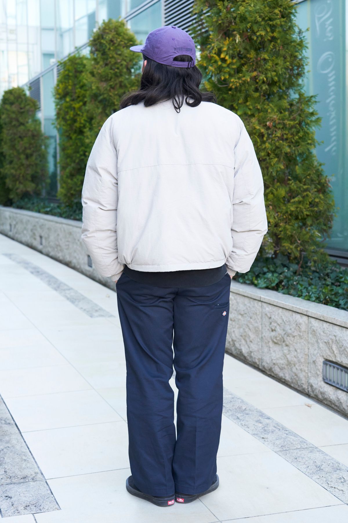 ややワイドシルエットのダブルニーを、白黒はっきりついたトップスとともに。ダウンジャケットとはワークなテイストが一致し、アウターを脱げば黒一色。実に潔い。