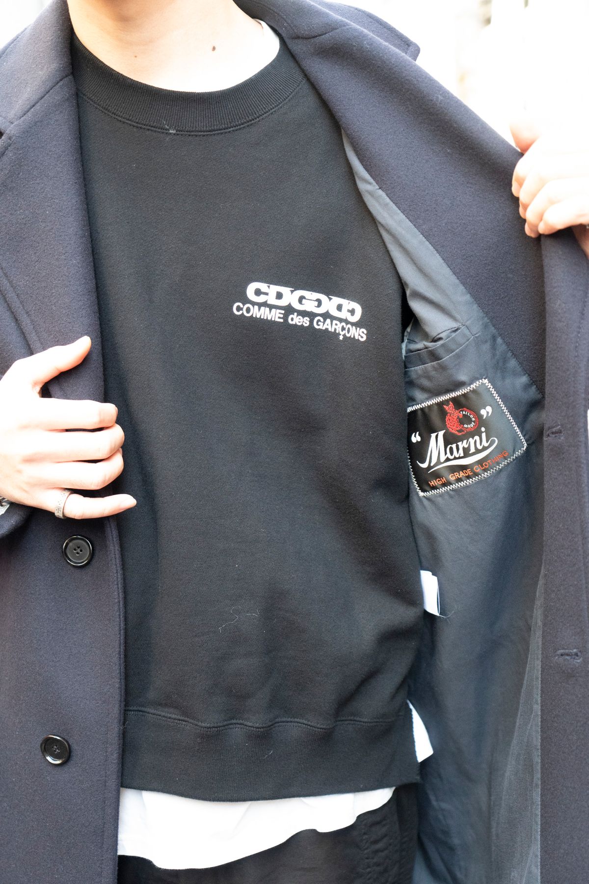 ファッション業界人にもファンが多い「ドリス ヴァン ノッテン」。名品揃いのこのブランドだが、太めの黒パンツも間違いなくそのひとつだ。見て取れるだけでもフロントに大きめなポケットが4つ。かなり個性は強いがシルエットの美しさのおかげで、悪目立ちすることはない。マルニのコートや黒スウェットともよく馴染み、モードな空気を香らせる。