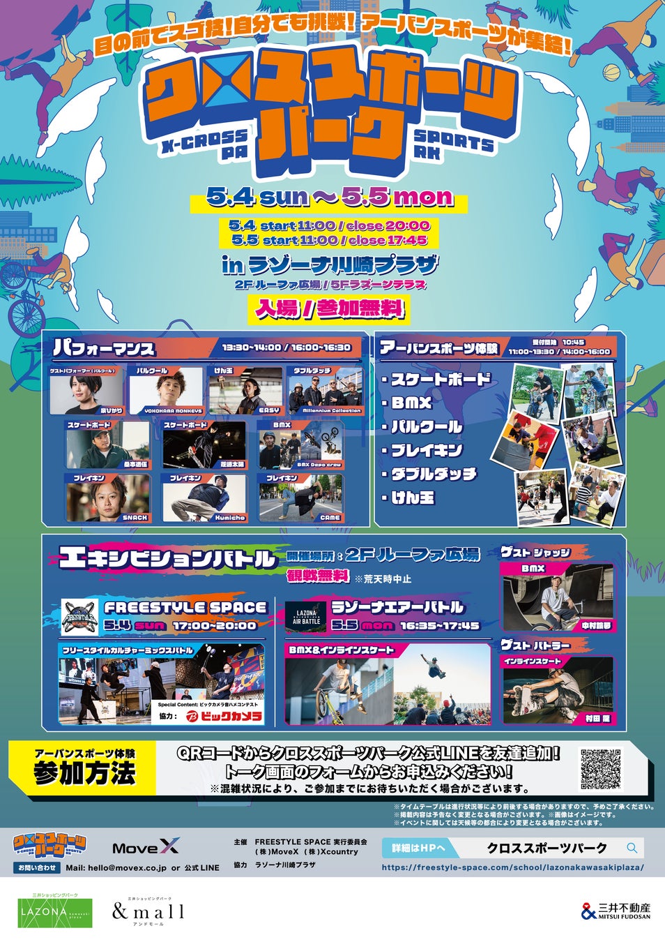 株式会社MoveXが主催するアーバンスポーツイベント「クロススポーツパーク」が、2025年5月4日(日)・5日(月・祝)の2日間、ラゾーナ川崎プラザにて開催される。