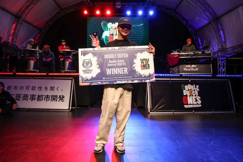 決勝に進んだのは、SHU-BOYとdaichi。なんと19歳差の対決。世代の異なる2人が同じステージで戦う姿は、ダブルダッチの持つ幅広い世代層と技術力の多様さを象徴する瞬間となった。トップロックの振りはもちろん、一発の技で観客を驚かせるネタの多いSHU-BOYに対し、daichiは細かい足のステップや音の取り方、アイソレーションの技術で勝負。異なる世代・スタイルのぶつかり合いは、最後まで拮抗した熱戦となった。