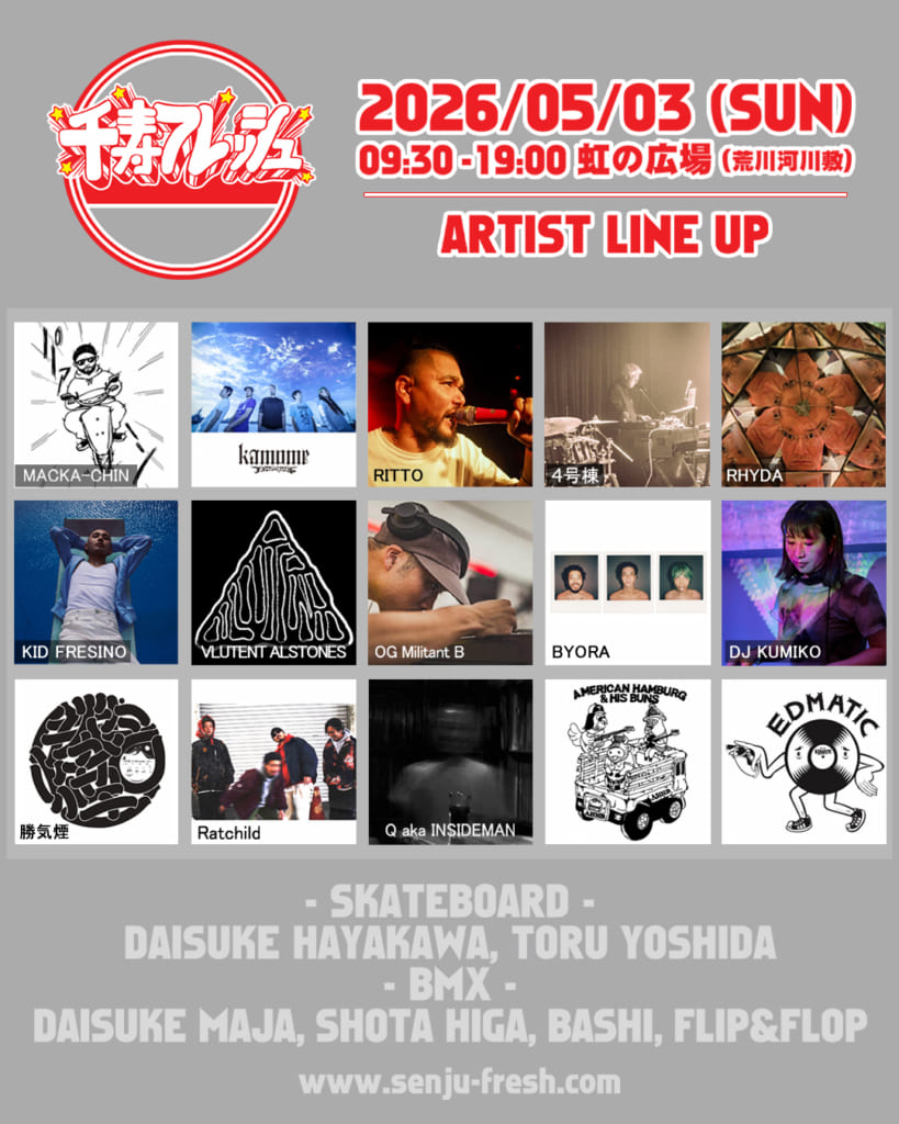「千住の魅力で千住を押し上げる」——その言葉通り、ストリートの遊びを本気で突き詰めた先に、リアルなカルチャーが生まれる。そして今回、その熱量に引き寄せられるように、豪華なメンツがこの街に集結。ローカルの枠を超えた一夜が、千住で始まる。