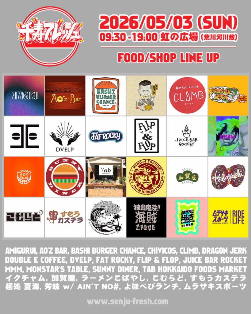 2026/5/3(日)、荒川河川敷「虹の広場」にて千寿フレッシュが開催。古き良き宿場町の風情と、尖ったストリートカルチャーが交差する街・千住。その熱狂の象徴とも言えるイベント千住フレッシュ八古屋ナイトが、さらなる進化を遂げて帰ってきた。