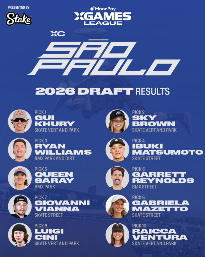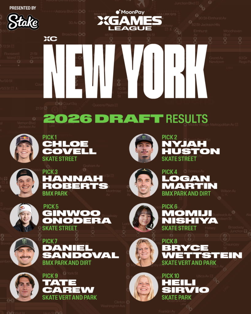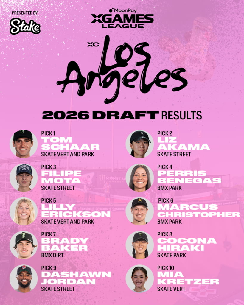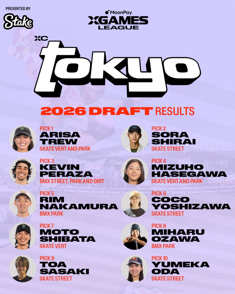 othersX Games発のプロリーグ「X Games League」の見どころと各クラブチームメンバーを徹底紹介!世界最大のアクションスポーツの祭典として長い歴史を持ち、夏季ではBMXやスケートボード、冬季ではスノーボードやスキーなどといったアクションスポーツを生業とする選手たちにとってはいつも目標とする舞台であり、夢が詰まったアクションスポーツ界で最も権威のある大会「X Games」。アクションスポーツシーンを常にアップデートし続ける「X Games」が今年の2026シーズンから始動するのが、X Games発のプロリーグ「X Games League(XGL)/ X ゲームズリーグ」。このプロリーグでは、個人競技であるアクションスポーツを各アスリートが個人としてだけではなく、所属するチームの一員としてシーズン優勝を目指して各大会を戦う、X Gamesが提供する新たな競技フォーマットであり観戦体験となる。本記事ではプロリーグである「X Games League」の概要と、このリーグで戦う選手たちが選ばれた「X Games League Summer Draft」について、そして各クラブチームの紹介を含めたX Games Leagueの見どころを紹介する。 X Games League/Xゲームズリーグとは ©︎X Games 「X Games League(XGL)」はドラフトを通して選出された選手たちが各クラブチームに所属して戦うプロリーグ。このリーグでは毎年開催されているX Gamesの各大会にて選手たちが個人でのメダルを目指して戦う従来のシステムと並行し、所属チームとしてもポイントを稼ぎチームでの年間優勝を目指す。 なお当リーグはアクションスポーツ界で初となる年間制、チーム制、男女混合のリーグであり、クラブに所属した選手には金銭面でのサポートも受けられるなど、選手側としても賞金やスポンサーフィーだけではない、大きなメリットが得られる体制が敷かれアクションスポーツシーンのさらなる可能性を見出すことがこのリーグの目的とされている。 ただ、全ての選手がこれらのクラブに所属できるわけではなく、ドラフトにて選出された選手だけが対象となり、それ以外のドラフトで選出されなかった選手は今までと同様に個人(フリーエージェント)として大会への招待を受けて出場することとなる。ただ何らかの理由で各クラブチームから欠員が出た場合はフリーエージェントへのオファーを通して充填されることが決まっている。 「Xゲームズリーグ・サマードラフト」にて4つのクラブチームに所属するアスリートたちが決定! ©︎X Games そしてXGLの幕開けとして、第1回となる2026年MoonPay X ゲームズリーグ (XGL) サマードラフトが、2026年3月13日にカリフォルニア州ハリウッドパークのCosm Los Angelesで開催された。 今回のドラフトでは、夏季シーズンを争う4つのX ゲームズクラブ(XC ニューヨーク、XCサンパウロ、XCロサンゼルス、XC東京)から、各クラブのゼネラルマネージャー(GM)が、XGLへ参加表明した180名ほどのスケートボードおよびBMXのアスリートの中から国籍問わず男女各5名づつ計10名を指名し、4クラブで合計40名を選出した。なお各クラブは2026年6月26日〜28日にアメリカ・カリフォルニア州サクラメントで開催される「X Games Sacramento 2026」にて今シーズン初戦に臨み、その後、翌週7月4日〜7月5日に千葉県で開催される「X Games Chiba 2026」へ、そして最終戦としてアメリカ・ルイジアナ州ニューオリーンズで行われる「X Games New Orleans 2026」といった全3戦を通してシーズンチャンピオンを目指すこととなる。 ©︎X Games 下記ではドラフトで各クラブチームに選出されたメンバーの紹介と、それぞれのクラブが持つ特色を含めて編集部が独自の目線でラベリング。合わせて今シーズンの見どころも紹介していく。クラブごとに四者四様全く異なる雰囲気を持つため、是非本記事を通してアスリート個人だけではなくクラブとしての「推し」を見つけて今シーズンの観戦をより楽しんでもらえたら幸いだ。 とにかくカッコいい!スタイルが光るアクションスポーツの原点を提示する「XCロサンゼルス」 ©︎X Games 【チームメンバー】トム・シャー(アメリカ合衆国)、赤間凛音(日本)、フェリペ・モタ(ブラジル)、ペリス・ベネガス(アメリカ合衆国)、リリー・エリックソン(アメリカ合衆国)、マーカス・クリストファー(アメリカ合衆国)、ブレイディ・ベイカー(アメリカ合衆国)、開心那(日本)、ダショーン・ジョーダン(アメリカ合衆国)、ミア・クレッツァー(オーストラリア) このクラブの印象は一言で言えば「スタイリッシュ」。世界トップの唯一無二のスタイラーが集まっているチームでまさにストリートカルチャーの発信地ロサンゼルスを象徴するクラブだ。もちろん実力は言うまでもなく折り紙つきでX Gamesや世界大会で多くのメダルを獲得しているメンバーが若手からベテランまで幅広く所属。編集部としては、派手な大技よりも玄人好みの高難度トリックでカッコいいライディングを魅せるライダーが多いイメージがあり、その代名詞としてスケートボードのトム・シャーやフェリペ・モタ、BMXのペリス・ベネガスがい