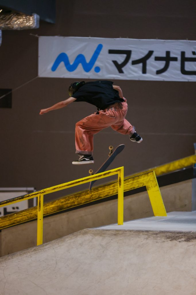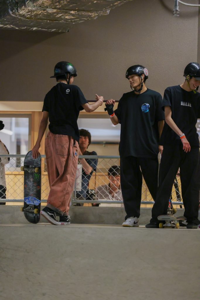 安倍来夢が「アーリーフロントサイド180スイッチフィーブルグラインドリバート」で81.20pt、藪下が「ビガースピンフリップフロントサイドボードスライド」で83.62ptを出して、まずスコアをフルマークさせた。