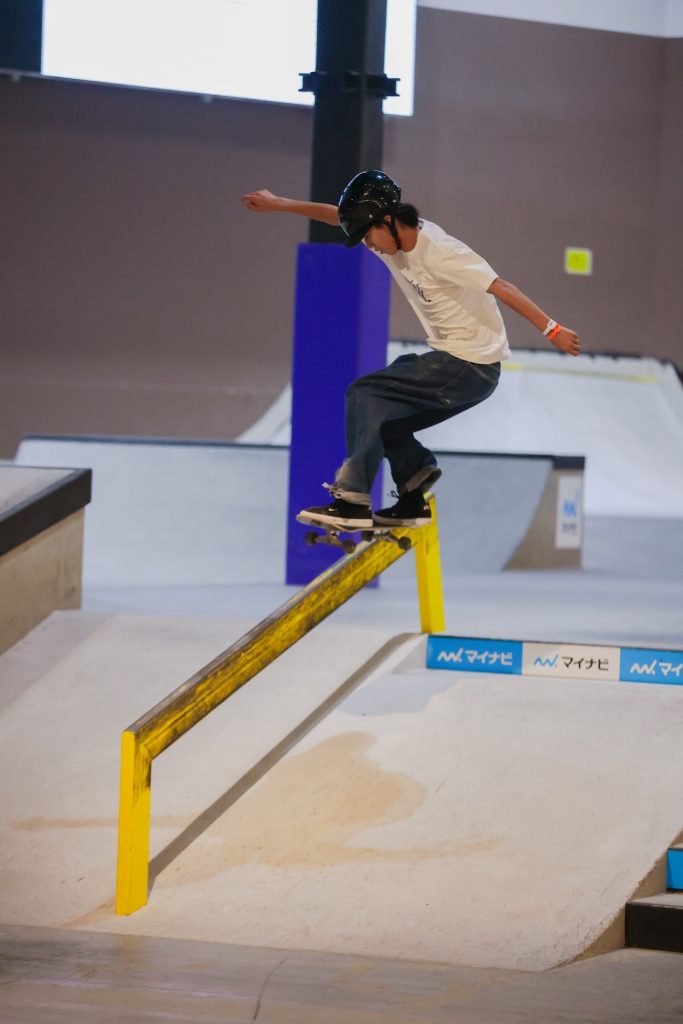 まずは藪下が「キックフリップバックサイドスミスグラインド」で84.14ptとハイスコアをマーク。