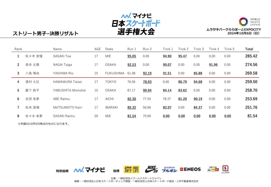 しかし今大会には出場しなかったパリ五輪組、前回王者の小野寺吟雲、白井空良、さらには五輪連覇の日本の、いや世界の絶対王者堀米雄斗が前を走っている現状。次に続くのが世界大会で決勝常連となっている根附海龍、東京五輪出場の青木勇貴斗。