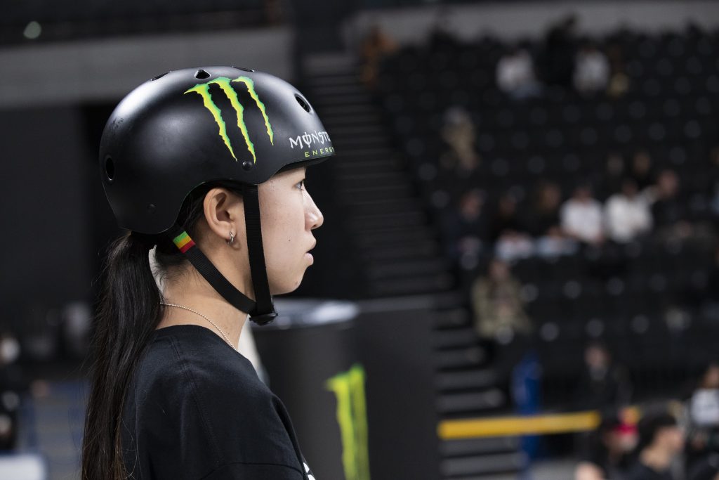 ここでは1トライ目とは異なり全体的に攻めのトリックチョイスとなった2トライ目。まずは1トライ目で8.0ptをマークし幸先良いスタートを切った吉沢がここでも決める。今年の夏のパリオリンピックでの金メダル獲得の決め手となった彼女の代名詞トリックでもある「ビックスピンフリップフロントサイドボードスライド」をレールで決めると7.8ptをマーク。ハンドレールのような大きなセクションではないレールでのメイクだったためスコアは伸びきらなかったがそれでもしっかりスコアをマークして強さを見せた。