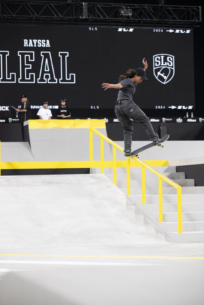 その中でのこの1本目はどのライダーもうまくまとめて決勝での流れを掴みたいと考える中で、唯一7点台の高得点をマークしたのはブラジルのライッサ・レアウ。先にライディングした日本人ライダーたちがミスを重ねる中、レアウはスピードが付けづらい方向では無理せずしっかり着実にラン構成を組み立てていた事はさすがで、「バックサイドクルックドグラインド」でランを始めると、「フロントサイドブラントスライド」や「キックフリップバックサイドリップスライド」などを綺麗にメイクしてトリックを繋いでいき、ラストトリックではミスがありながらも7.2ptの好発進を見せ、後続のライダーにプレッシャーをかけた。