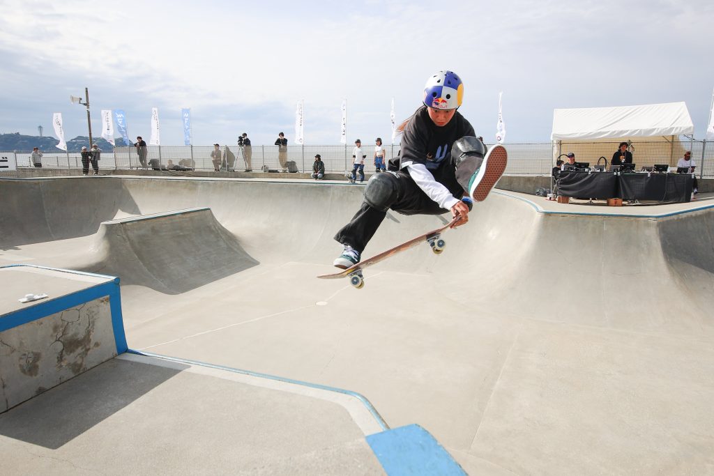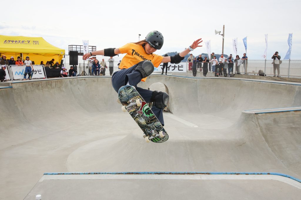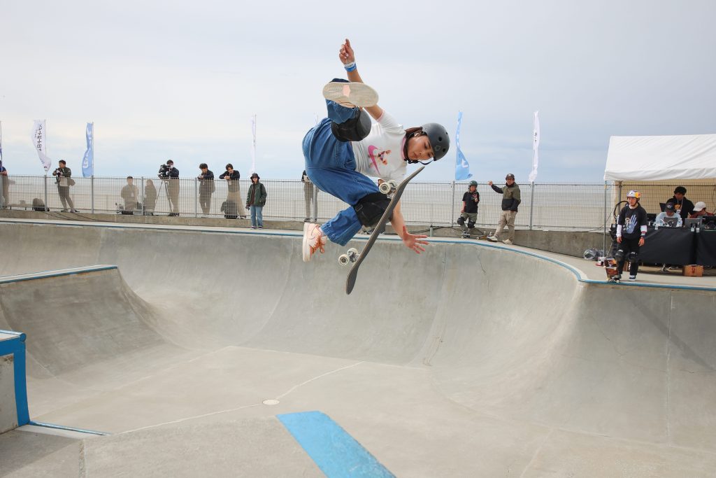 さらにその鷹野よりも大きくスコアをアップデートして見せたのが、ここ鵠沼スケートパークをローカルとしている藤井雪凛。1本目では中盤にトランスファーでの「アリーウープノーズグラブ」で転倒してしまったものの2本目では見事に修正。トランスファーでの「キックフリップインディグラブ」をはじめ、「アリーウープノーズグラブ」、そして決勝では彼女だけが見せた中央のスパインからサイドのボウル面へのトランスファーをメイク。トリックだけではなく終始高いエアーとスムーズなライディングでランをまとめて66.93ptまでジャンプアップした。