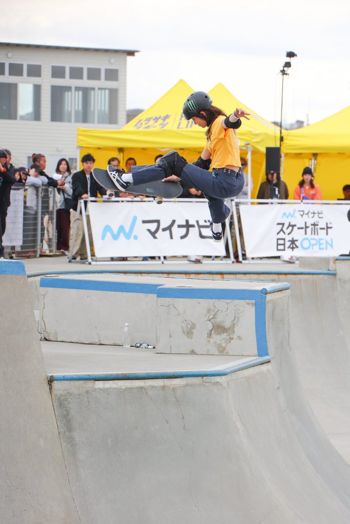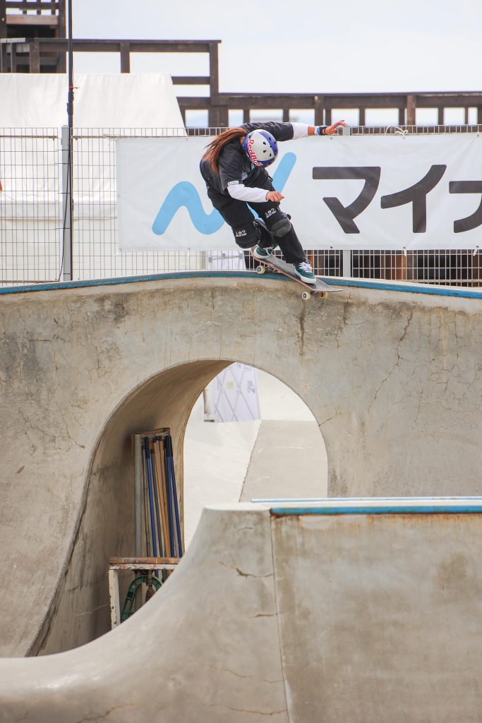 今大会予選1位通過で決勝に挑む草木ひなのは、1本目から暫定1位のスコアをマークするライディングを見せる。全体的に余裕を感じさせるスタイルで一つ一つ丁寧にトリックをこなしていく彼女はトランスファーでの「アリーウープサランラップ」や、コーピングでの「バックサイドスミスグラインド」、そして最後はディープエンドで「フロントサイドロックンロールスライド」をメイクしてランを終えると67.88ptをマーク。2本目以降でのライディングでのアップデートを予感させるライディングで1本目を終えた。