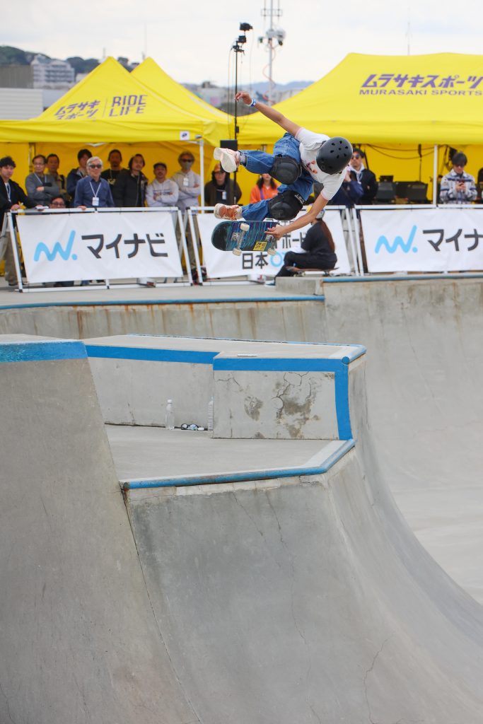 そして気になるのは貝原、藤井、そして草木によるトップ3争い。まず貝原がさらにスコアを伸ばすべく終盤で「フェイキーバリアルフリップインディグラブ」にトライするも転倒し惜しくもスコアアップならず。続いて藤井は前半で「キックフリップインディグラブ」に失敗し残念ながら草木に迫ることはできなかったが、その後藤井は時間外で本来メイクしたかったディープエンドでの「マックツイスト」をギャラリーに向けてメイクし会場を盛り上げた。