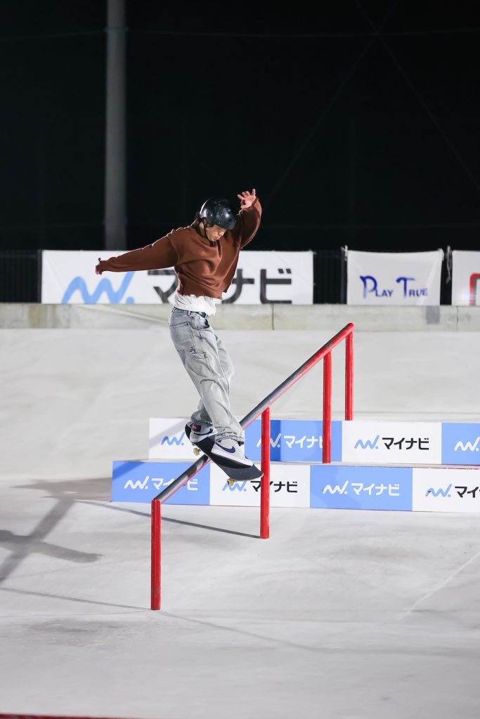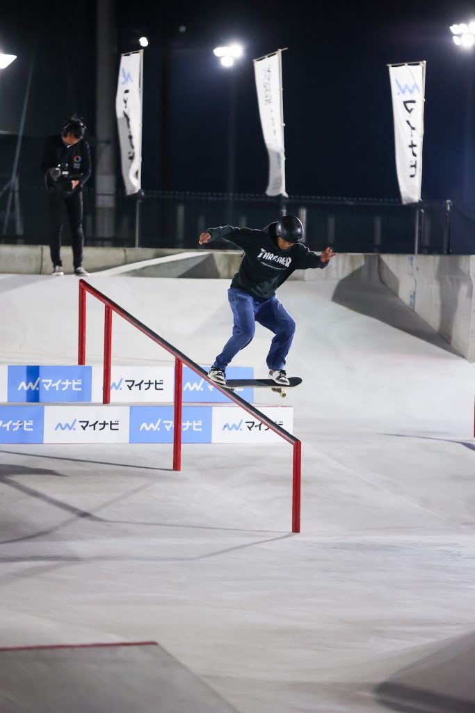 ここまでスコアメイクに苦戦していた池田は何か閃いたようにメインのステアからかなり幅のあるトランスファーでのダウンレッジでフロントサイド50-50にトライするも惜しくもミスとなったが本人は何か手応えを掴んだ様子にも見えた。